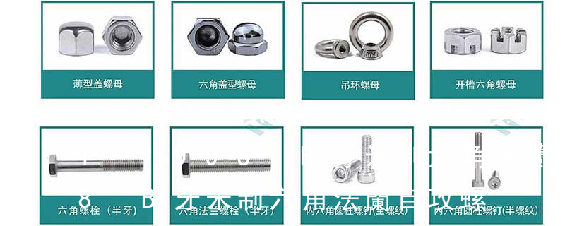 其中、國(guó)標(biāo)、德標(biāo)、日標(biāo)用M表示(例如M8、M16),美制、英制則用分?jǐn)?shù)或#表示規(guī)格(如8#、10#、1/4、3/8)。 主要分類包括普通螺絲、機(jī)螺絲、自攻螺絲和膨脹螺絲三種。 有頭螺釘Cap screw 過(guò)去限于全牙的扣件。 六角頭螺釘Hex cap screw與大六角螺栓Hex bolt 顧名思義為頭部為六角型的外螺紋扣件,設(shè)計(jì)為使用扳手轉(zhuǎn)動(dòng)。依照ASME B18.2.1標(biāo)準(zhǔn),六